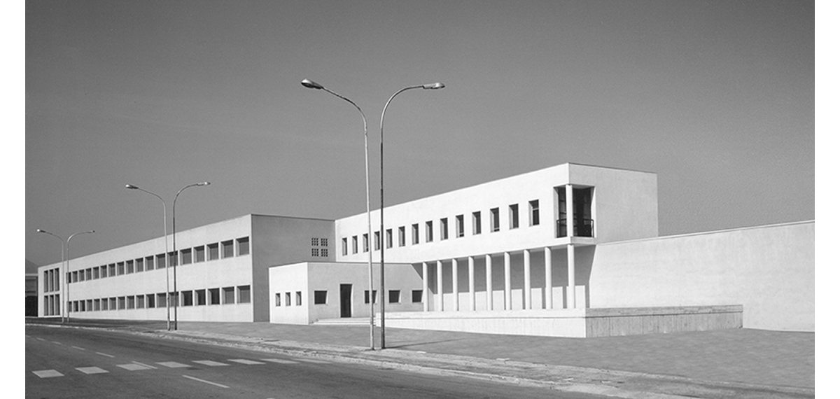 L’edificio per l’amministrazione. É un corpo di fabbrica di due piani, compreso fra i muri i capannoni industriali preesistenti e una nuova parete finestrata lungo la strada, con finestre a nastro per gli spazi ripetuti degli uffici, e con trifore per quelli singolari dell’ingresso e delle riunioni.
